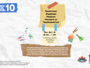 (Fan)Zines (handmade magazines) are a fun and accessible way to mark periods of change. Learn about the history of zines, how to create a zine using one sheet of paper, and reflect on your own transition to Lehigh as you make a zine. We will also view some of the zines in Lehigh's Special Collections for inspiration.