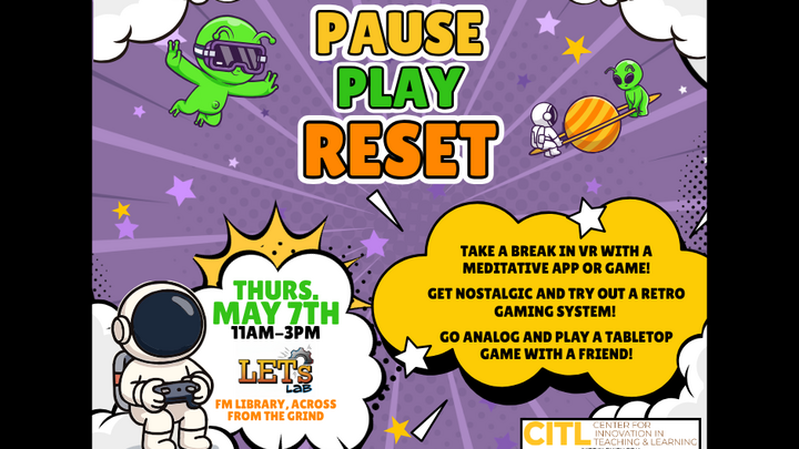 Pause, Play, and Reset for finals! Unwind in VR with a meditative app or game, get nostalgic and try out a retro gaming system, or go analog and play a tabletop game with a friend!