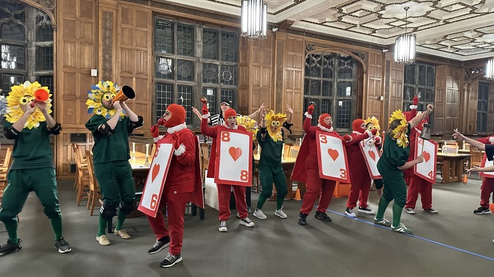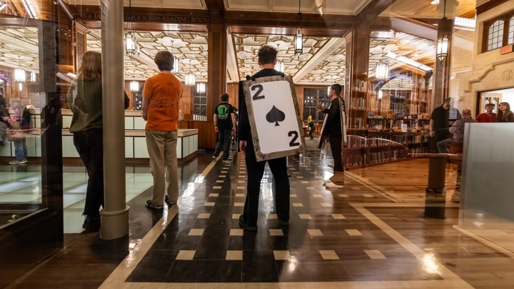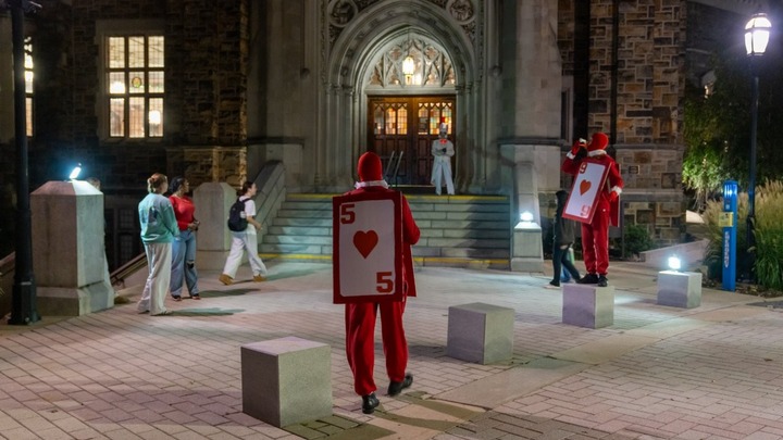 The event opened with the curious sight of guards in red at the library’s entrance, a nod to Alice’s passage through the looking glass. From there, attendees roamed through five distinct scenes staged across Linderman’s architectural landmarks.