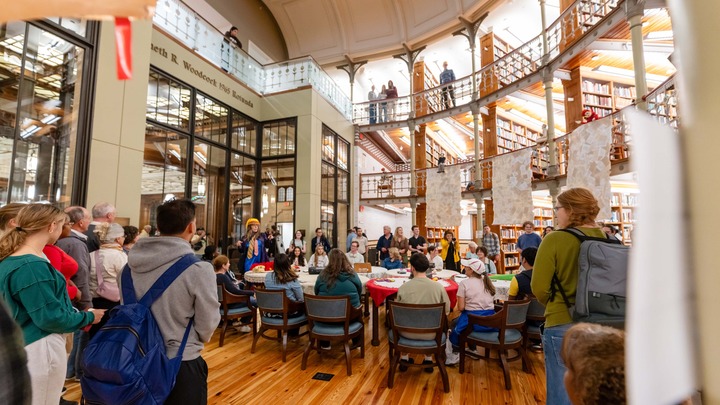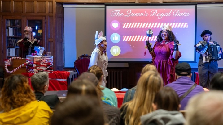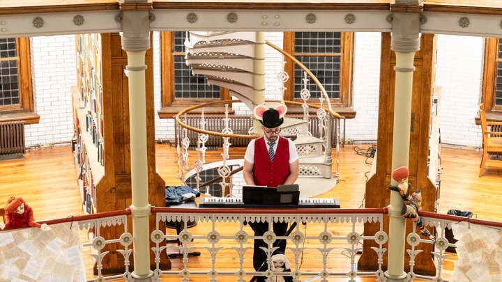 On the evening of October 8, around 300 students, faculty, and community members stepped into a transformed Linderman Library at Lehigh University, immersed in a world of data, story, and surprise. Alice in Informationland—a collaboration between Lehigh University Libraries and Touchstone Theatre, supported by the Friends of the Lehigh University Libraries—invited audiences to wander through a theatrical reimagining of Alice in Wonderland, exploring AI, algorithmic flow, and the evolving role of libraries in the information age.