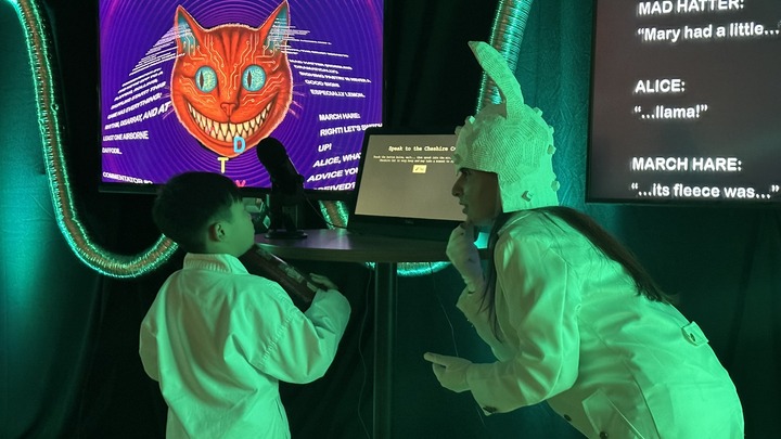 - On the lower level, participants encountered the Cheshire Cat, reimagined as an AI-driven interlocutor that scrambled letters and posed riddling questions.