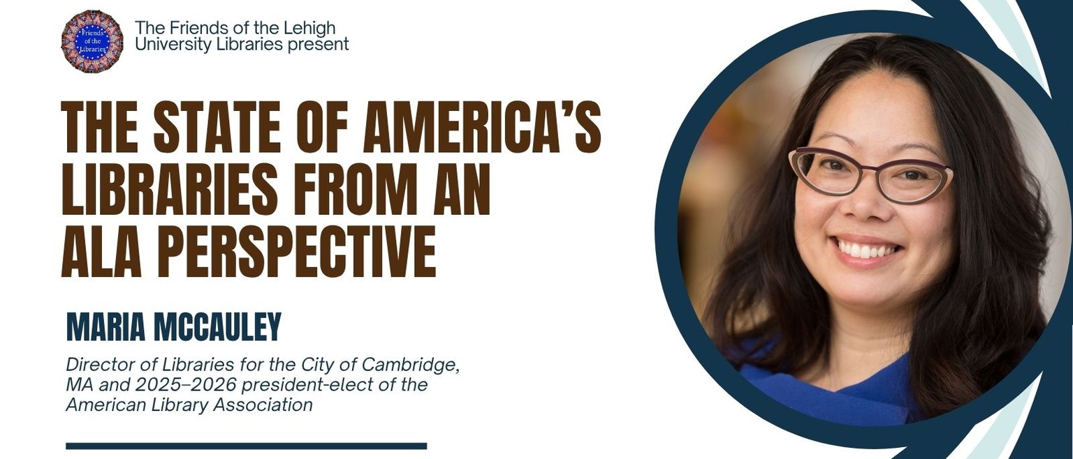 The Friends of the Lehigh University Libraries invite you to join us on Monday, December 1, 5:00 p.m. to 6:30 p.m. in Whitaker Lab Auditorium (Room 303) for The State of America’s Libraries from an ALA Perspective, presented by Maria McCauley, Director of Libraries for the City of Cambridge, MA and 2025–2026 president-elect of the American Library Association.